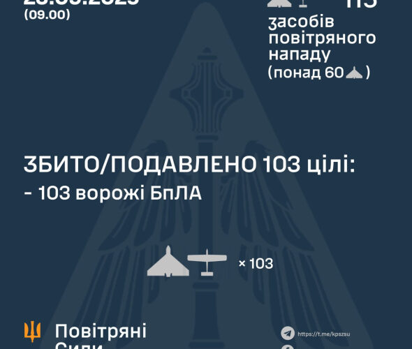 “Станом на 09:00, протиповітряною обороною збито/подавлено 103 ворожі БПЛА типу Shahed, “Гербера” і дронів інших типів на півночі, півдні та сході країни”, – ідеться в повідомленні.