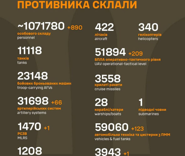 Загальні бойові втрати ворога у війні становлять 1 071 780, повідомляє Генеральний штаб ЗСУ.