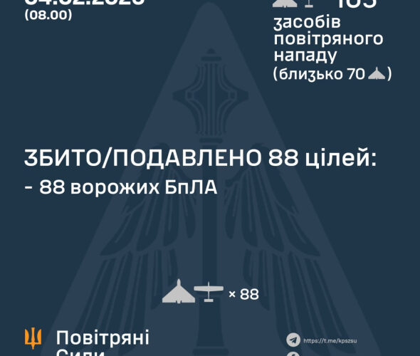 “Станом на 8:00 протиповітряною обороною збито/подавлено 88 ворожих БпЛА типу Shahed, “Гербера”, “Італмас” та дронів інших типів на півночі, півдні та сході країни”, – ідеться в повідомленні.