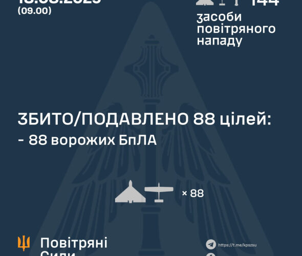 “Станом на 09:00, протиповітряною обороною збито/подавлено 88 ворожих БПЛА типу Shahed і дронів-імітаторів різних типів на півночі, півдні, сході та в центрі країни”, – ідеться в повідомленні.