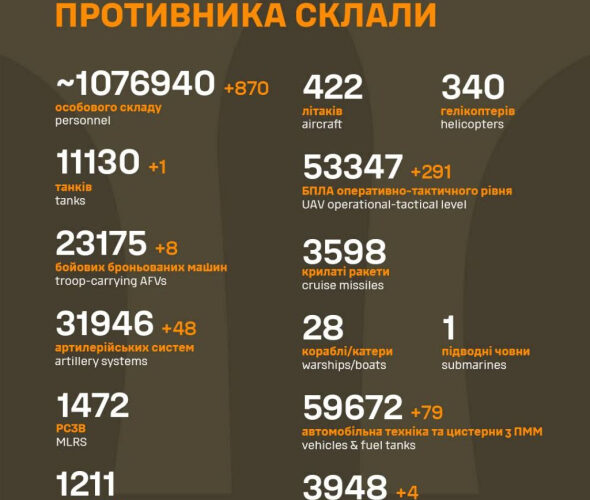 Загальні бойові втрати ворога у війні склали 1 076 940. Про це повідомляє Генеральний штаб ЗСУ.