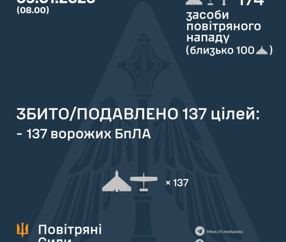 “Станом на 08:00 протиповітряною обороною збито/подавлено 137 ворожих БпЛА типу Shahed, “Гербера” і дронів інших типів на півночі, центрі та сході країни”, – сказано в повідомленні.